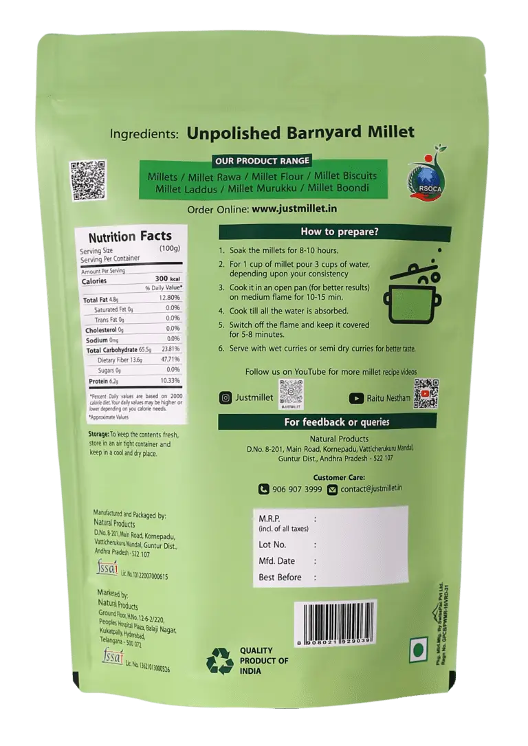 Indulge in the wholesome goodness of Barnyard Millet, a versatile and nutritious ancient grain that offers a plethora of health benefits. Known for its nutty flavor and delicate texture, Barnyard Millet is a gluten-free grain that is rich in fiber and essential nutrients. Whether you’re looking to add variety to your meals or enhance your overall well-being, Barnyard Millet is a perfect choice.