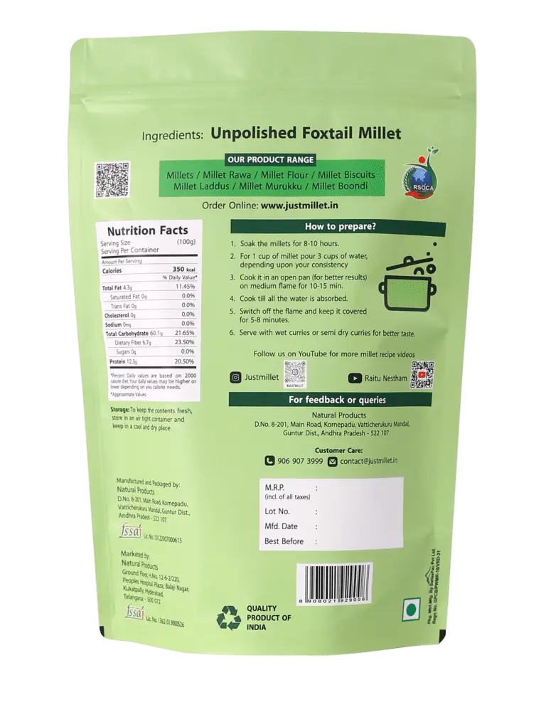 Perfect for a variety of dishes like porridge, upma, and pilaf, Foxtail Millet is easy to cook and versatile. Its nutty flavor and light texture make it suitable for both savory and sweet preparations. A great addition to any diet looking for healthier, nutrient-dense alternatives to traditional grains.