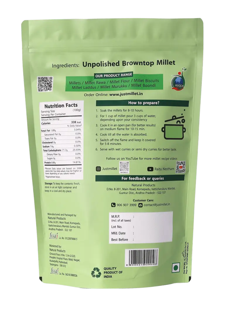 Experience the natural goodness of Browntop Millet, a nutrient-rich ancient grain that offers a delightful nutty flavor and a satisfying texture. Browntop Millet is a gluten-free and versatile grain that is a great addition to a healthy diet. Packed with essential nutrients and fiber, this millet is a wholesome choice for those seeking a nutritious and delicious alternative to traditional grains.